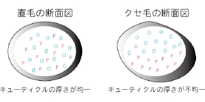 毛髪の中にはコルテックス(毛皮質)と言われる部分が存在します。更にこれを分けるとOコルテックスとPコルテックスに分類する事が出来ます。両者の特性として、Oコルテックスは浸水性で柔らかく、Pコルテックスは撥水性で硬いという性質を持っています。直毛はこのOとPが均一に混ざりあっていますが、癖毛はこの2つが偏っているという特徴があります
