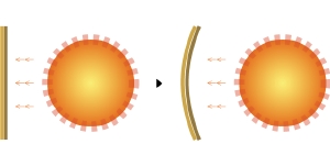 例えば、厚さと種類の異なる二枚の板を張り付けて日の当たる場所に置いておくと、図のように反ってしまいます。これは太陽の熱で、板の水分が蒸発して起こる現象です。毛髪もこれと同様に、2種類の水分量の違うOとPコルテックスが偏ることによって反りが生じます
