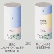 Mr.ハビットで使用される縮毛矯正第1剤は、従来の薬液とは全く異なり、特殊樹脂が40%も配合されている為に、毛髪に艶が出て感触も良くなり、傷みにくくする効果もあります(図2参照)